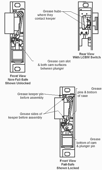 Note: Never lubricate any strike with oil, such lubrication collects dirt and forms an abrasive and sticky compound that may affect the function of the strike.